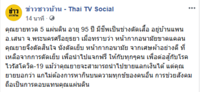 จากสถานการณ์โควิด 19 ที่แพร่ อยู่ในช่วงนี้ ในทุกมุมโลก ล่าสุด เพจเฟซบุ๊กชื่อ ข่าวชาวบ้าน Thai TV Social ได้ออกมาเล่าโพสต์เรื่องราวของคุณยายทวด 5 แผ่นดิน โดยได้ระบุข้อความว่า คุณยายทวด 5 แผ่นดิน อายุ 95 ปี มีชีพเป็นช่างตัดเสื้อ อยู่บ้านแพน อำเภอ เสนา จังหวัด พระนครศรีอยุธยา เมื่อทราบว่า หน้ากากอนามัยขาดแคลน คุณยายจึงตัดสินใจ นั่งตัดเย็บ หน้ากากอนามัย จากเศษผ้าอย่างดี ที่เหลือจากการตัดเย็บ เพื่อนำไปแจกฟรี ให้กับทุกๆคน เพื่อต่อสู้กับโรคไวรัสโควิด19 แม้ว่าคุณยายจะสามารถนำไปขายแลกเงินได้ แต่คุณยายบอกว่า แกไม่ต้องการหากินบนความทุกข์ของคนอื่น การช่วยสังคมถือเป็นการตอบแทนคุณแผ่นดิน